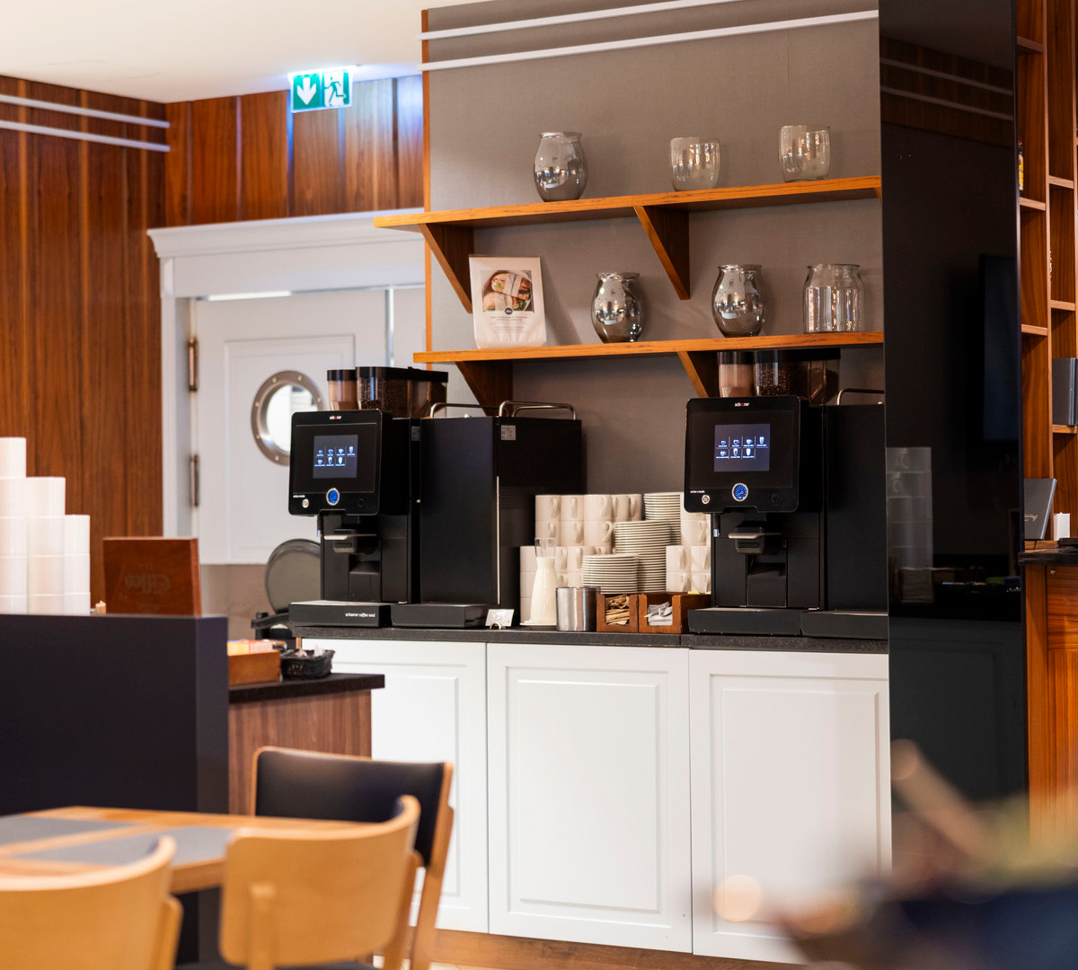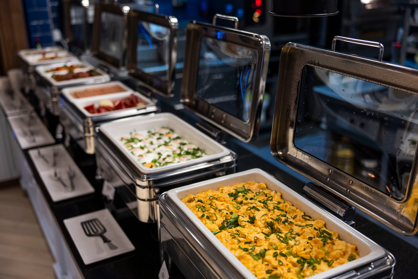 Breakfast buffet with chafing dishes, stacked pastries, cereal dispensers and coffee in a bright dining area with wood accents.