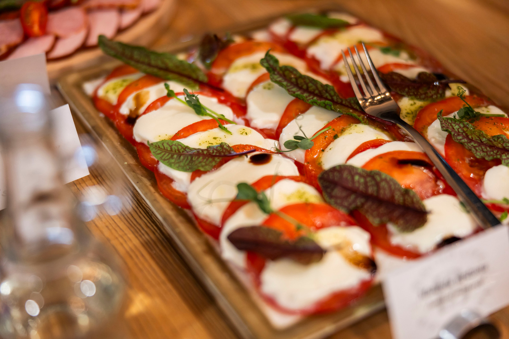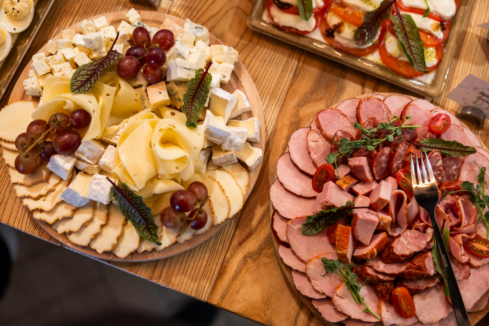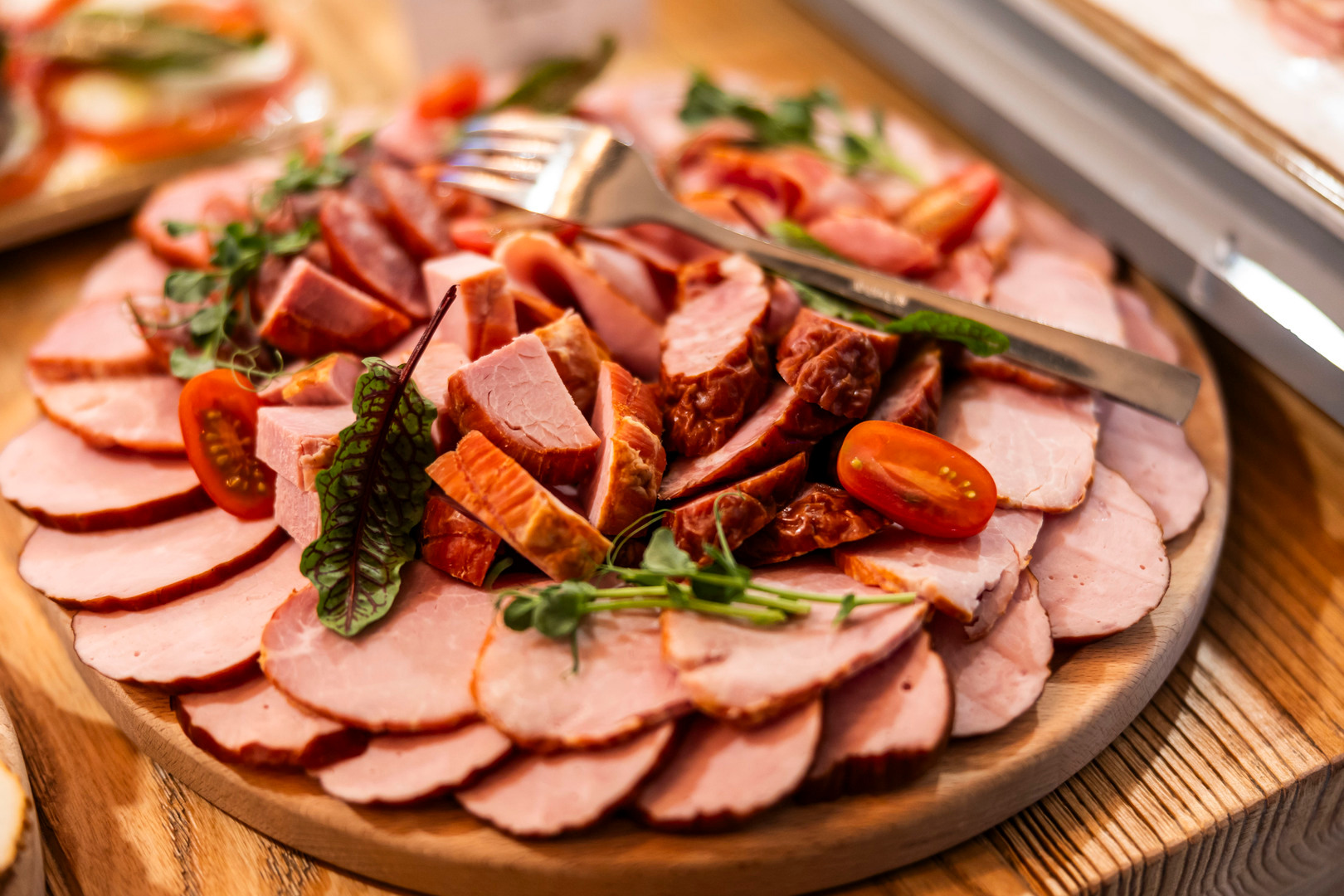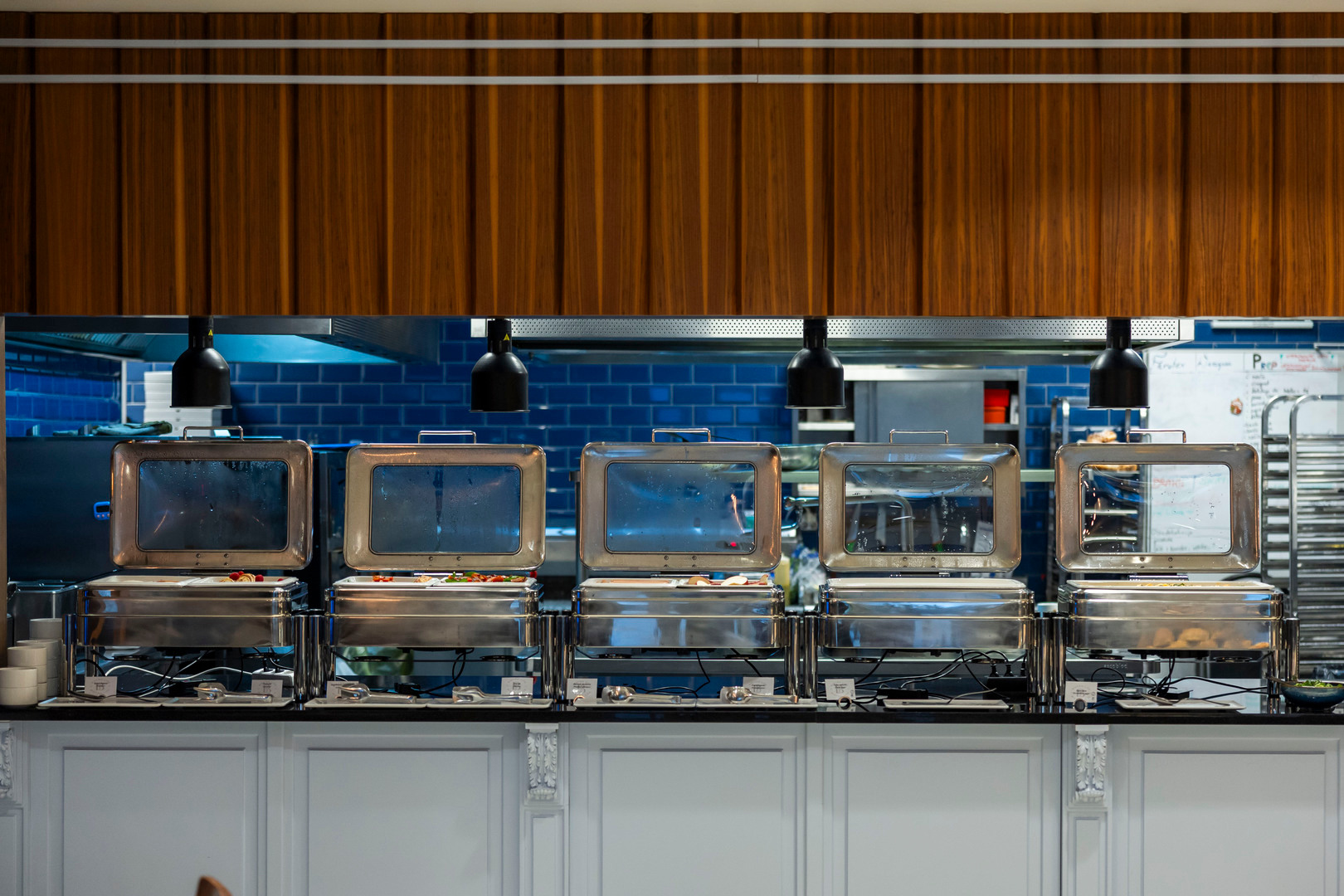 Generous hotel buffet of cold cuts, cheeses and salad bowls on a wooden counter beneath warm pendant lights