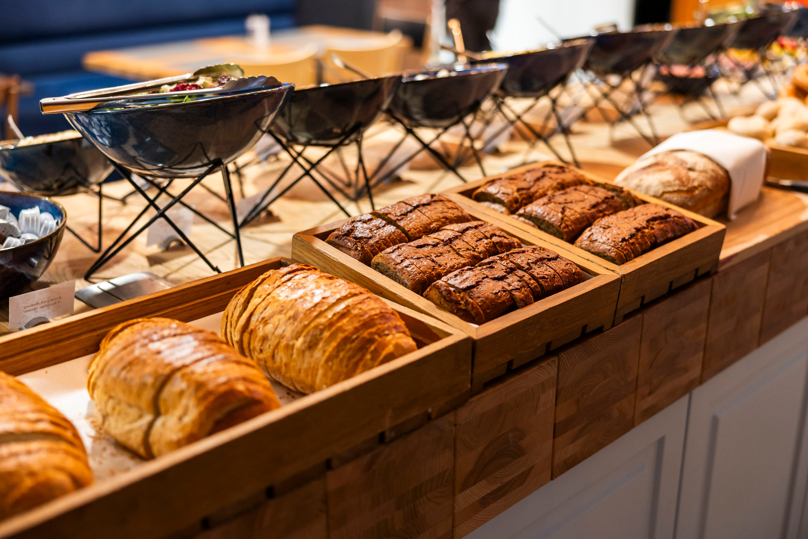 Breakfast buffet with breads, cheeses and cold cuts on a wooden island, coffee station, booth seating and warm pendant lights