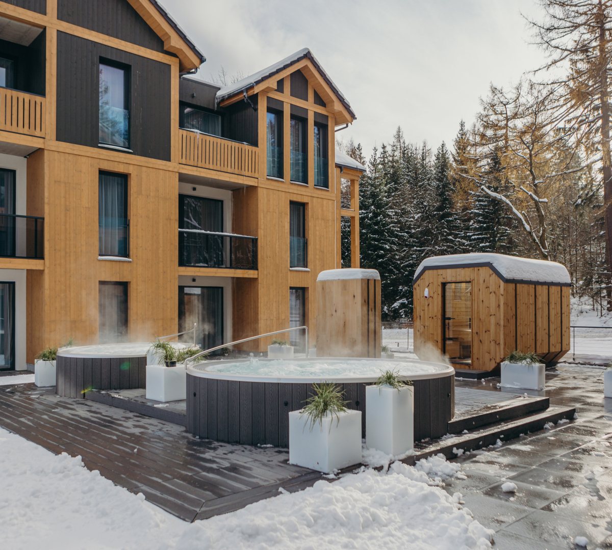 Goście Rezydencji AQUA by GRANO mogą korzystać z wyjątkowej strefy wellness na tarasie zewnętrznym, gdzie czeka na nich sauna oraz jacuzzi pod gołym niebem. To idealne miejsce na odprężenie po aktywnym dniu, niezależnie od pory roku. Relaks w ciepłej wodzie z widokiem na malownicze górskie krajobrazy pozwala na pełne wyciszenie i regenerację. Taras wellness to idealna przestrzeń dla osób szukających harmonii, odpoczynku i chwili tylko dla siebie.